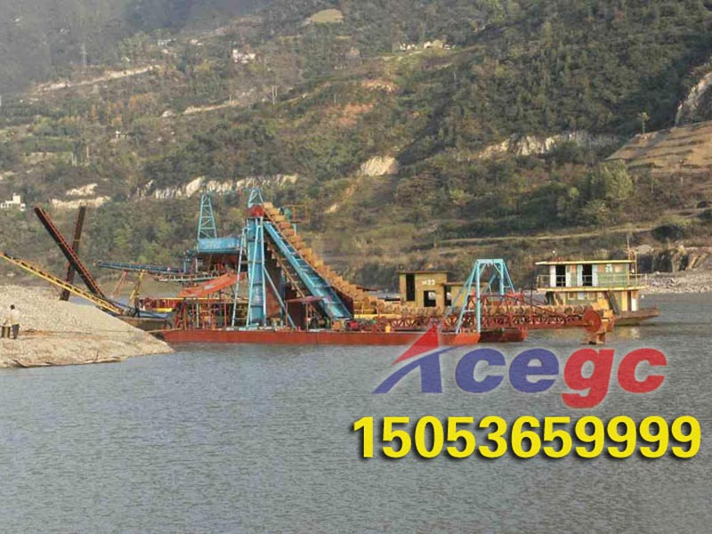 另外一種是河道采沙金設備,大部分指的是沙金淘洗設備船舶類,常見的有鏈斗式采沙金機械,鉆探式采沙金設備,小型采沙金設備等,下圖為冠誠重工生產的鏈斗式采沙金設備,通過鏈斗挖出沙石,通過配備溜槽,離心機,跳汰機等沙金選別設備進行沙金洗選。